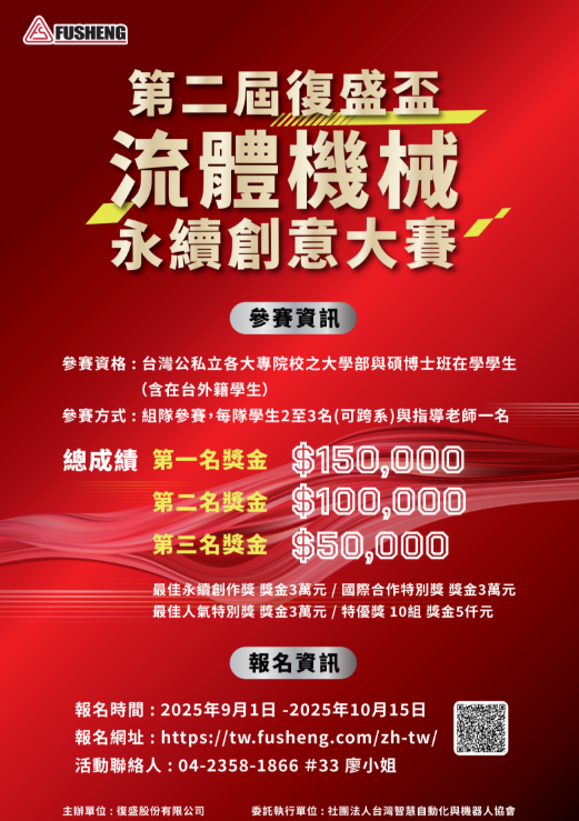 第二屆「復盛盃流體機械永續創意大賽」正式啟動,誠摯邀請全台大專院校的青年學子組隊參加!本屆賽事由復盛股份有限公司主辦 ,並由社團法人台灣智慧自動化與機器人協會執行 ,旨在鼓勵學生將流體機械的專業知識與永續發展理念結合,激發創新思維。