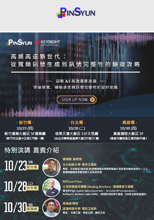 14:10 – 14:50    TDR/AFR 實務應用 — PCB 與高速介面阻抗分析14:50 – 15:20    Tea Break15:20 – 16:00    新世代寬頻信號源 — 多通道相位同步與低雜訊應用16:00 – 16:20    互動回饋 & 幸運抽獎